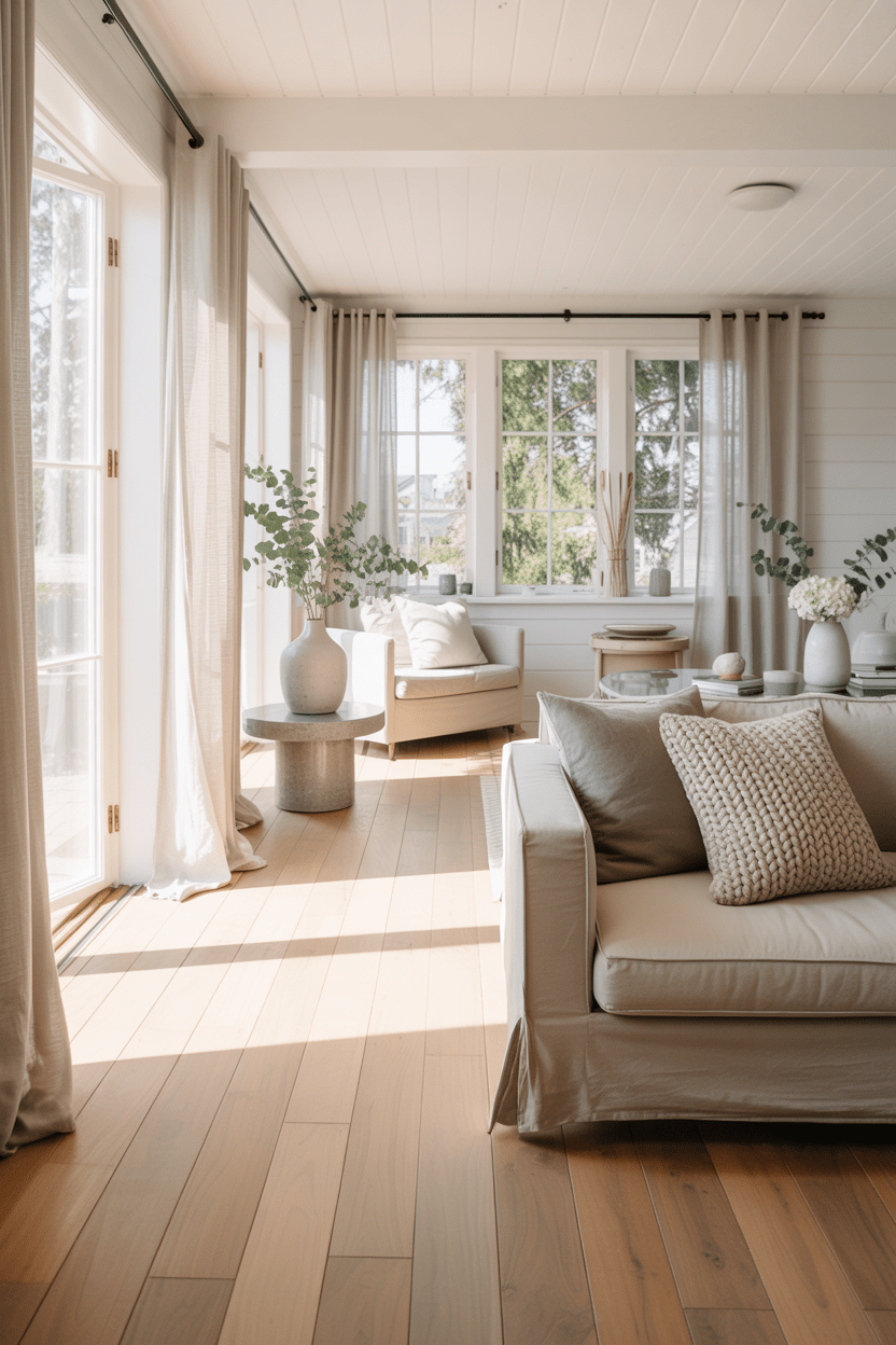 Bright Scandinavian summer house interiors are one of the easiest ways to create that airy vacation feeling. I love using white walls, light wood floors, and soft neutral textiles. Add linen curtains and simple decor pieces to keep the space feeling clean and bright.