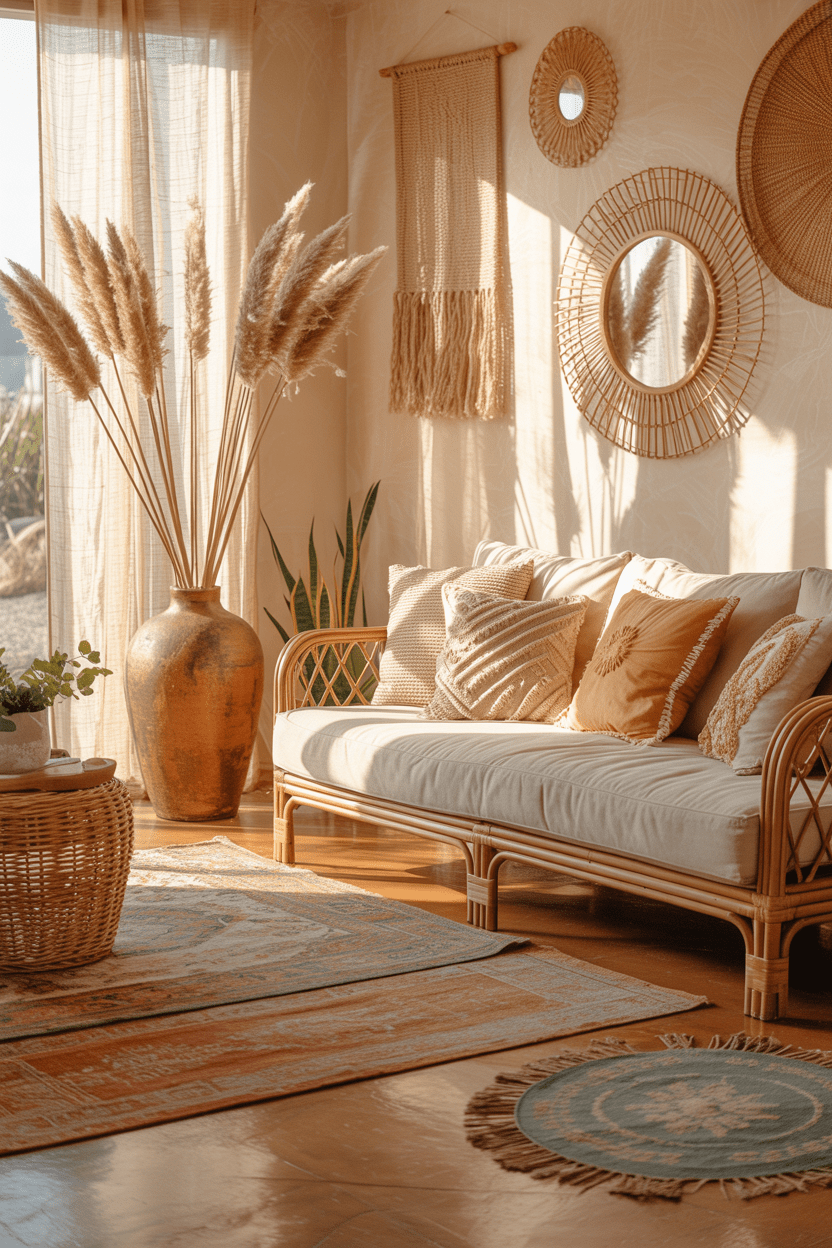 Boho summer house aesthetic interiors are playful and expressive. Layer rattan furniture, textured rugs, and natural fiber decor pieces. Pampas grass or dried florals add softness and movement.