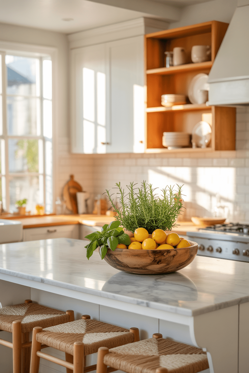 Summer house kitchen interiors should feel bright and welcoming. Open shelving, light cabinetry, and fresh herbs make kitchens feel like the heart of the home.