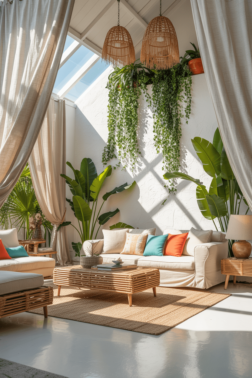 Tropical summer beach house interiors feel lush and energetic. Add large green plants, palm prints, and light airy curtains to bring the tropics indoors.