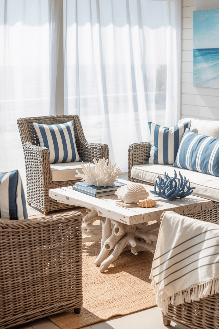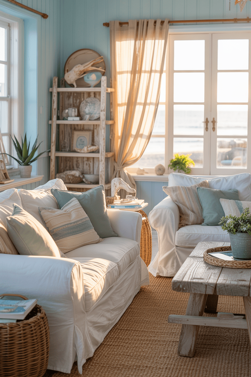Coastal summer beach house aesthetic interiors always make me think of long relaxing afternoons by the ocean. Use soft blues, sandy beiges, and natural woven textures. I like adding striped throw pillows and weathered wood accents for subtle beach charm.