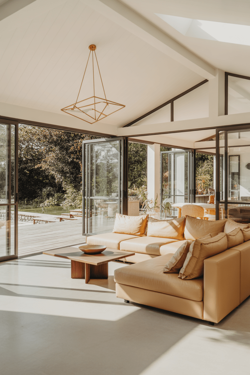Modern summer house living room interiors feel sleek but still relaxed. Choose low-profile furniture, large windows, and simple color palettes. The goal is to make the living room feel open, breathable, and easy to live in during summer months.