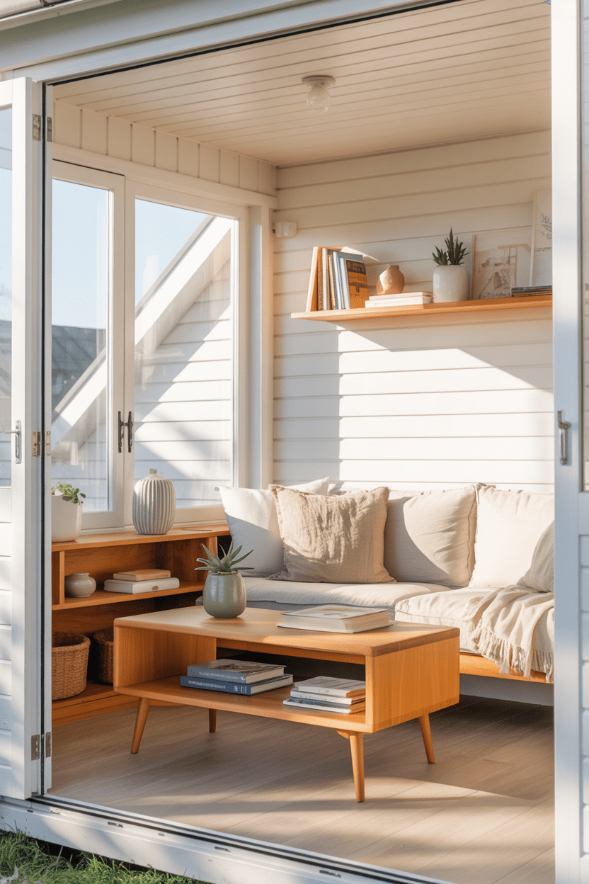 Small summer house interiors should feel charming, not cramped. I recommend built-in storage, multi-use furniture, and light colors on walls and ceilings. Mirrors can also help reflect light and make small spaces feel bigger.