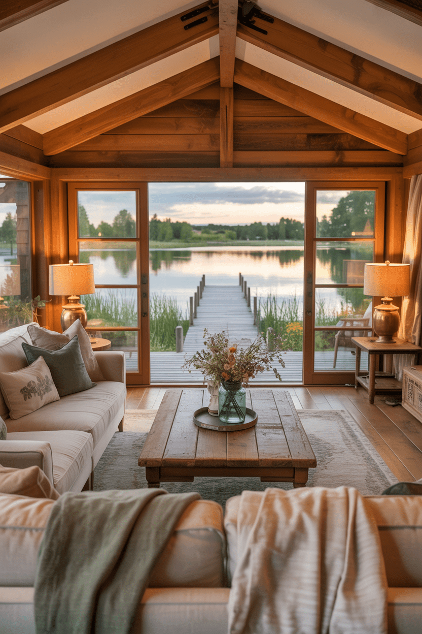 Lake house summer interiors are perfect for cozy relaxation. Use warm wood tones, comfortable seating, and soft lighting. Large windows that frame water views make this style especially magical.