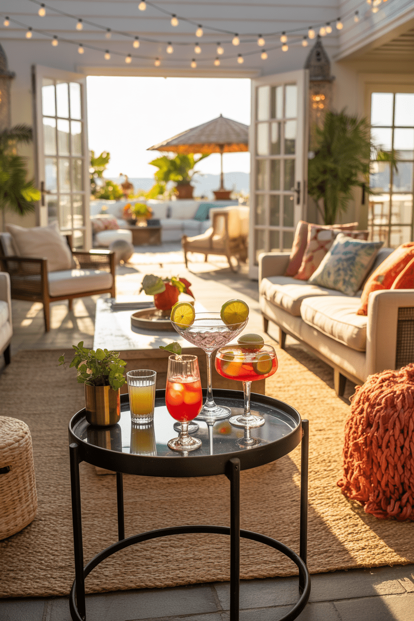 Summer house party interior spaces should feel social and relaxed. Add comfortable seating clusters, a casual dining area, and soft lighting for evening gatherings. I love including small decorative details that make entertaining easier.