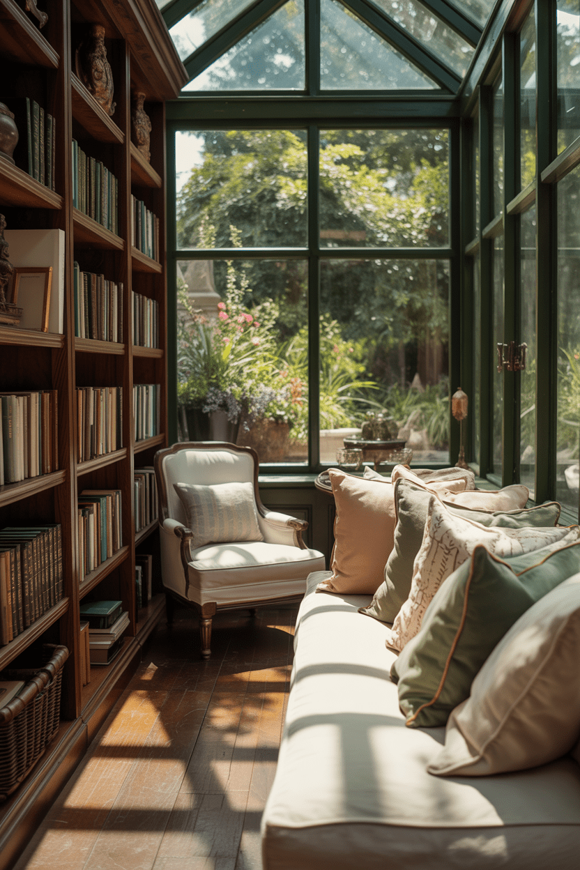 There is nothing more charming than a conservatory library. Built-in conservatory bookshelves, a deep armchair, and a small side table create the perfect reading conservatory retreat. Position seating to take advantage of garden views, and consider conservatory window dressing ideas that allow privacy without blocking light. This is one of my favorite small conservatory ideas interior design-wise because it feels purposeful and serene.