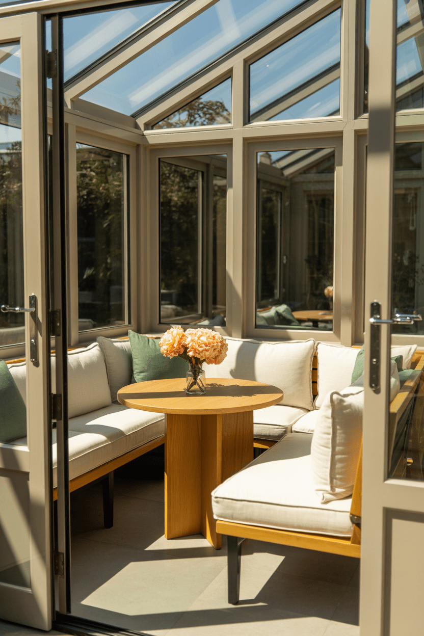 A conservatory breakfast room is such a charming way to start the day. Built-in bench seating with plush cushions and a round dining table in conservatory layouts feels intimate and practical. It’s perfect for small conservatory dining room ideas because it maximizes seating without overwhelming the space.