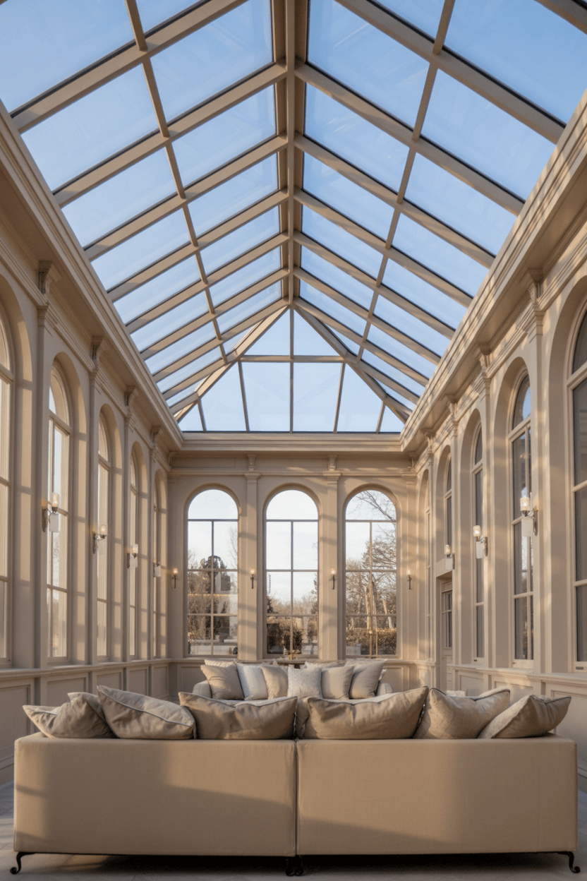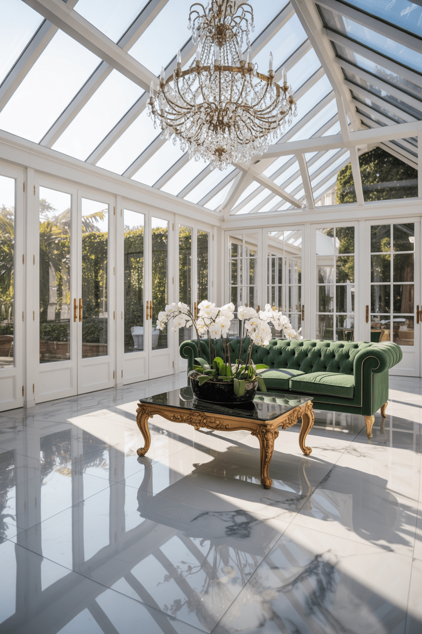 If you want full drama, a luxury conservatory with marble flooring, a grand conservatory chandelier, and elegant conservatory furniture inspiration creates a truly elevated look. Keep the palette refined and add subtle metallic accents. It feels glamorous but still classic.
