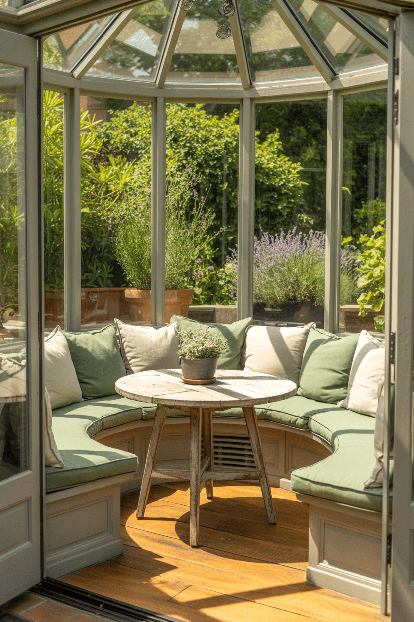 19. Conservatory breakfast nook with built-in bench seating