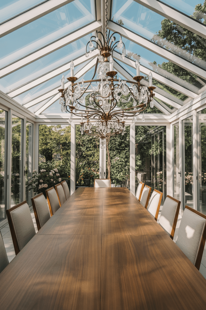 A conservatory dining room might be one of my favorite layouts because nothing beats hosting dinner under a glass roof conservatory. A large wooden or marble dining table anchors the space beautifully, especially in a dining room in conservatory setups where the light floods in from every angle. I love adding a sculptural chandelier or classic conservatory lighting to elevate the look. Keep the decor simple and let the architecture and natural light do most of the talking.
