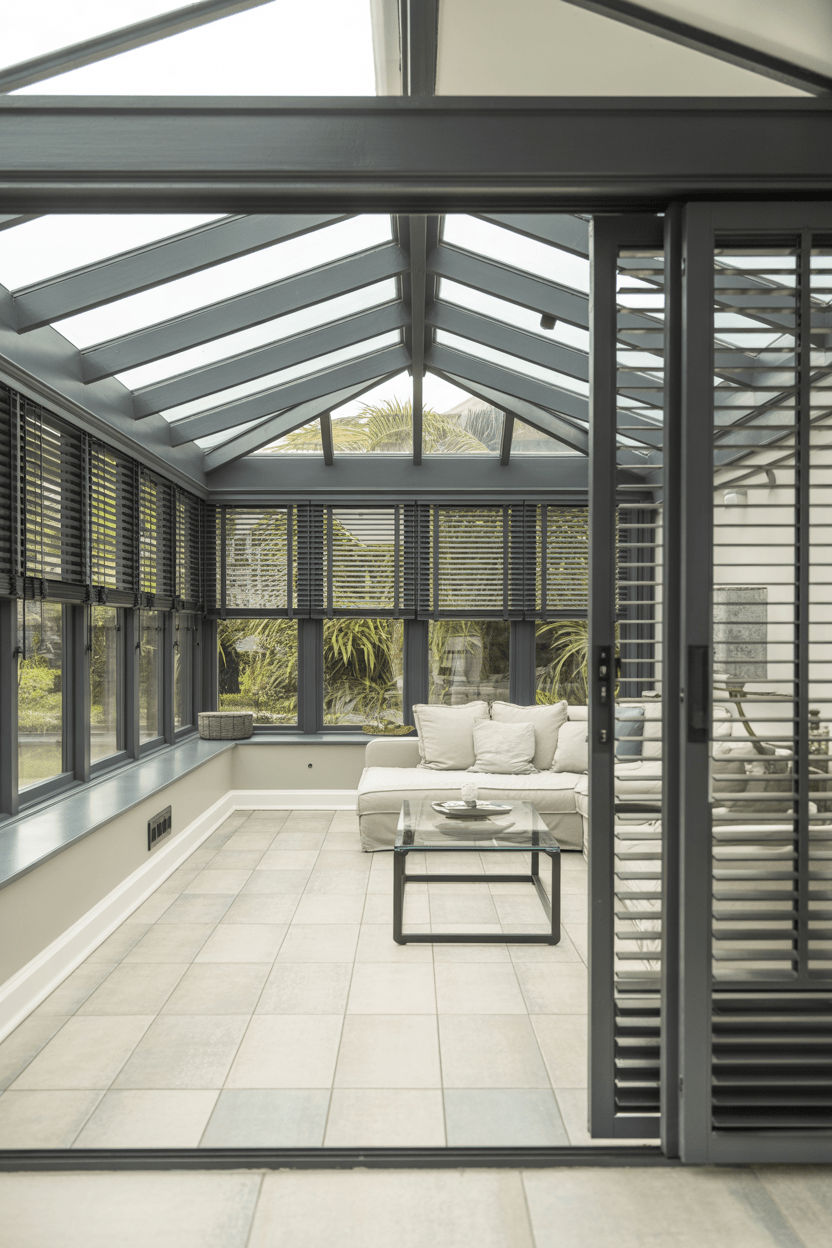 There is something so striking about a black conservatory with slim steel-style frames. A modern conservatory like this feels bold yet classic, especially when paired with neutral conservatory decor and clean-lined furniture. I recommend sticking to a tight color palette, layering textures instead of patterns, and incorporating modern conservatory blinds for a polished finish. It feels architectural, dramatic, and incredibly luxe.
