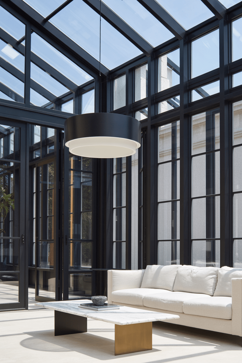 3. Modern black frame conservatory with minimalist decor