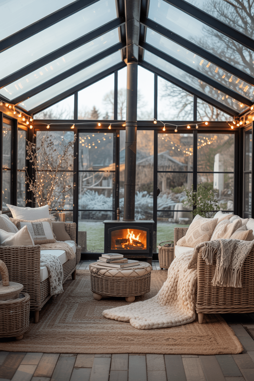 Cozy conservatory ideas are always trending for a reason. Adding a log burner in conservatory spaces completely changes how the room feels in winter. Layer rugs, cushions, throws, and soft conservatory curtains to create warmth against all that glass. When you combine natural light with hygge-inspired decor, you end up with a cozy conservatory that feels usable all year long.