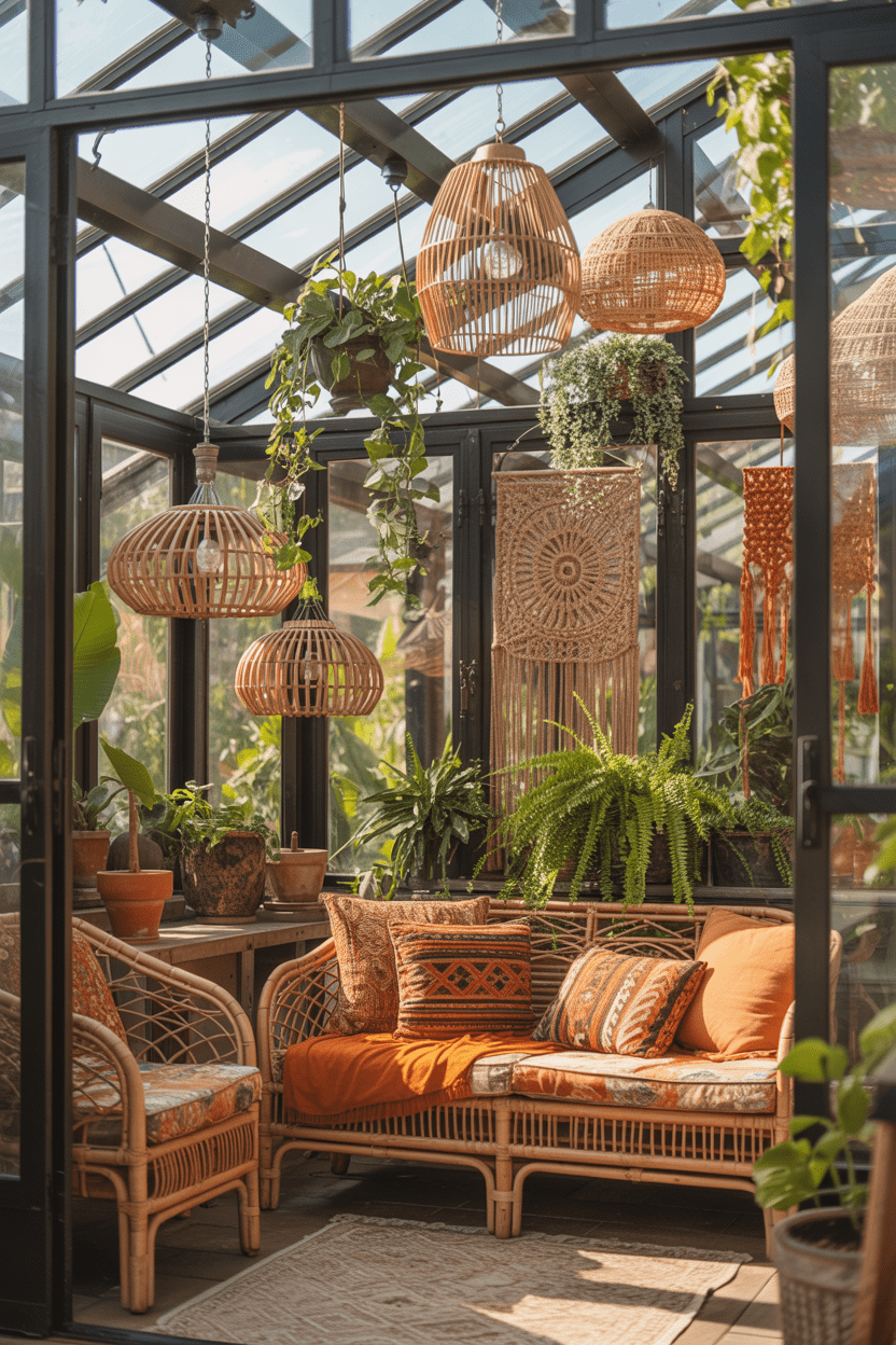 8. Boho conservatory with rattan and earthy decor