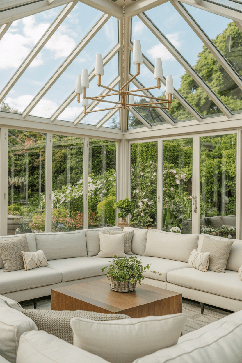 Turning your conservatory room into a full conservatory lounge instantly increases how often you’ll use it. A corner sofa conservatory setup maximizes seating without cluttering the space. Add a bold conservatory chandelier or oversized pendant to draw the eye upward. It makes the conservatory living room feel grounded and intentional instead of temporary.